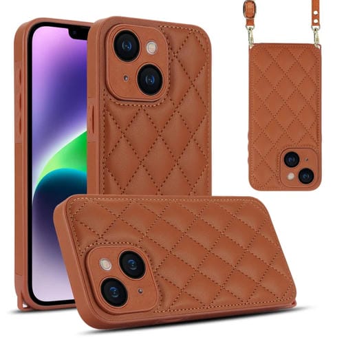 Funda para Teléfono iPhone 14 con Textura Rómbica y Cordón Doble (Marrón)