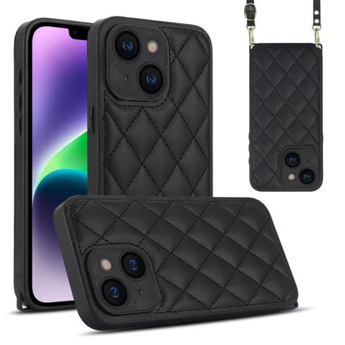 Funda para Teléfono iPhone 14 Textura Rómbica y Cordón Doble (Negro)