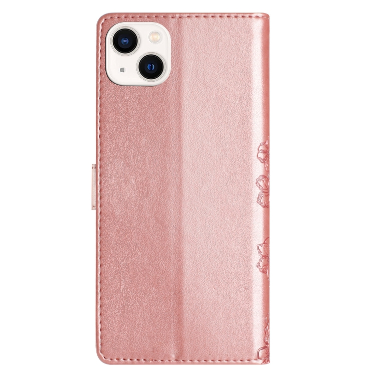 Funda para Teléfono iPhone 14 PU Sensación de Piel Mariposa y Flor de Cerezo En Relieve (Oro Rosa)