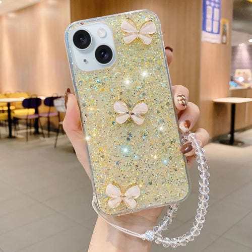 Funda para Teléfono iPhone 14 TPU Epoxi Mariposa de Jade Lentejuelas Estrelladas Correa (Amarillo)