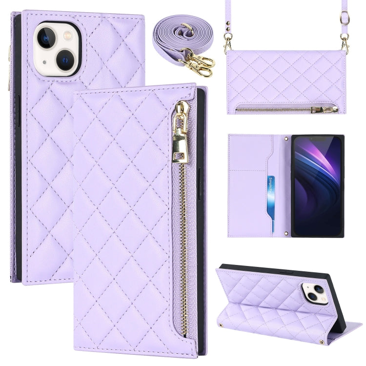 Funda de Cuero con Cremallera para iPhone 14 Grid Texture Lanyard (Púrpura)