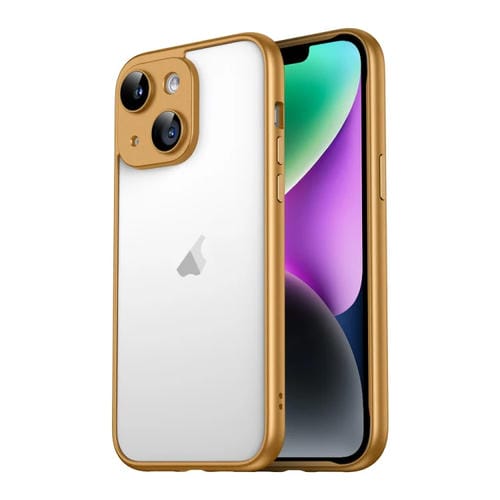 Funda para iPhone 14 Macaron PC Marco de Borde Puro con Película de Vidrio para Lentes (Dorado)