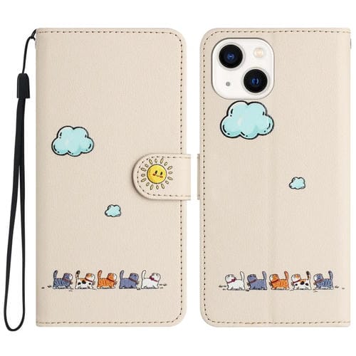 Funda de Cuero para Teléfono iPhone 14 Plus con Gatos de Dibujos Animados (Beige Blanco)