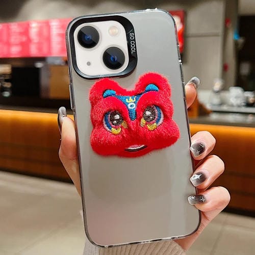 Funda para teléfono iPhone 14 Plus con muñeco de peluche y danza del león de año nuevo (León Rojo con parte posterior Gris)