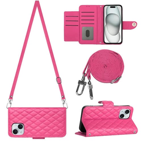 Funda para Teléfono iPhone 14 Plus Cuero Textura Rómbica con Tapa y Cordón Largo (Rojo Rosa)