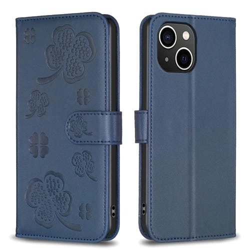 Funda para Teléfono iPhone 14 Plus Cuero con Relieve de Cuatro Hojas (Azul)