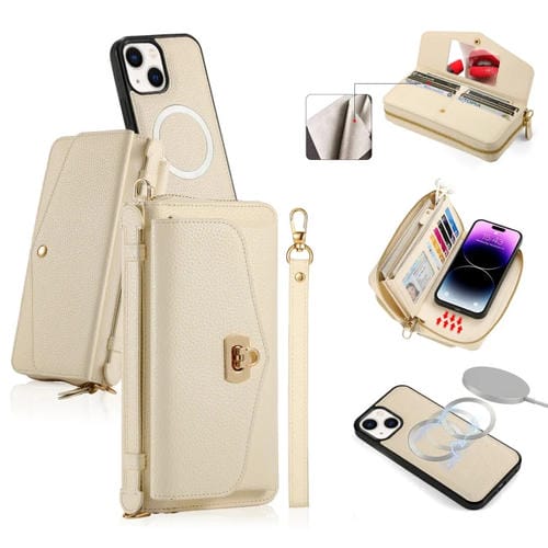 Pour iPhone 14 Plus MagSafe Crossbody Litchi Cuir Multifonctionnel Zipper Wallet Phone Case (Blanc)