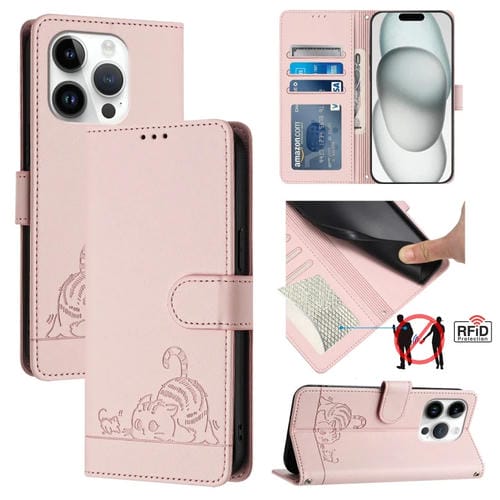 Estuche para teléfono iPhone 14 Pro Cat Rat con patrón en relieve RFID PU y correa para la muñeca (Rosa)