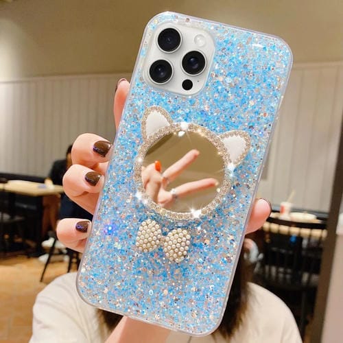 Estuche para Teléfono TPU Epoxi iPhone 14 Pro Max con Orejas de Gato y Diamantes con Lentejuelas Estrelladas (Azul)
