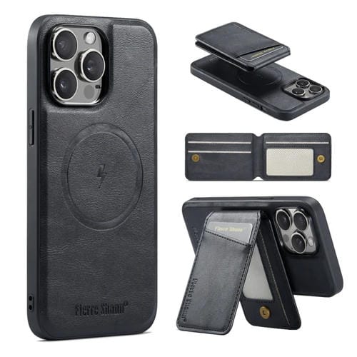 Funda para Teléfono Fierre Shann iPhone 14 Pro Max Oil Wax con Tarjetero Magnético de Cuero de Vaca (Negro)