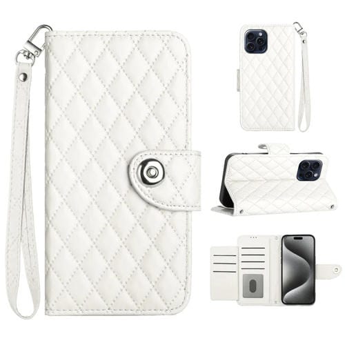 Funda para Teléfono iPhone 14 Pro Max con Tapa de Cuero Textura Rómbica y Cordón (Blanco)