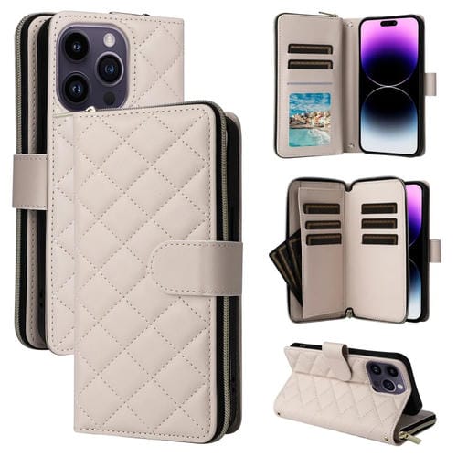 Funda para Teléfono iPhone 14 Pro Max Cuero Hebilla Torre Cremallera Rombal Cruzada Cordón (Beige)