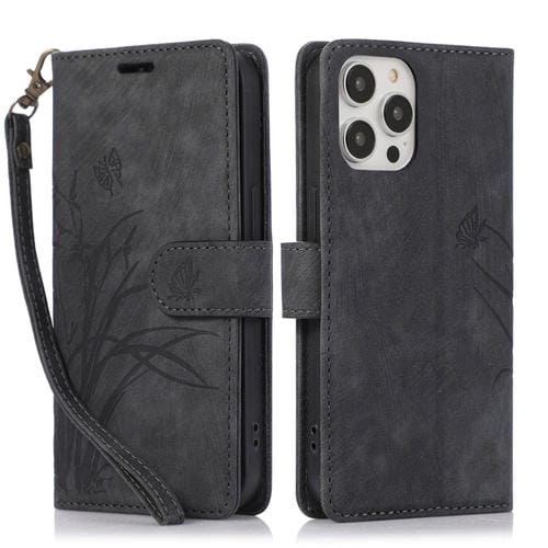 Funda para Teléfono iPhone 14 Pro Max Cuero Relieve Mariposa Orquídea (Negro)