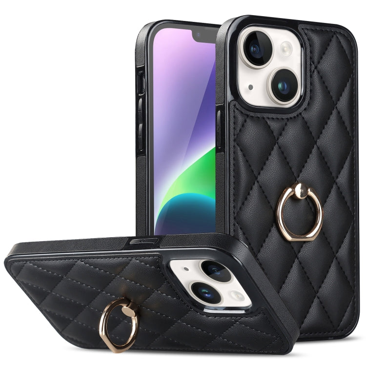 Funda para teléfono Rhombic PU Cuero para iPhone 14 con soporte para anillo (Negro)