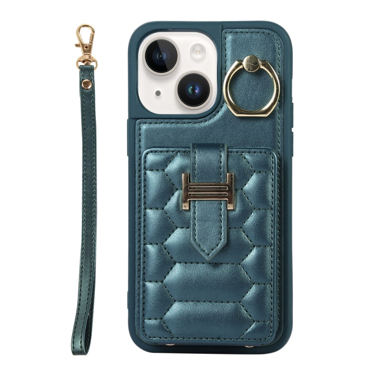 Funda para iPhone 14 Vertical Card Bag Ring Holder con Doble Cordón (Verde Oscuro)