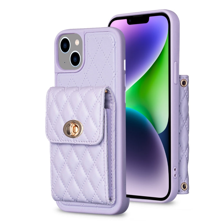 Pour iPhone 14 Étui de téléphone en cuir rhombique à boucle métallique verticale (violet)