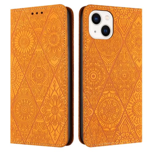 Estuche para teléfono iPhone 15 Cuero Adsorción en Relieve Étnico (Amarillo)