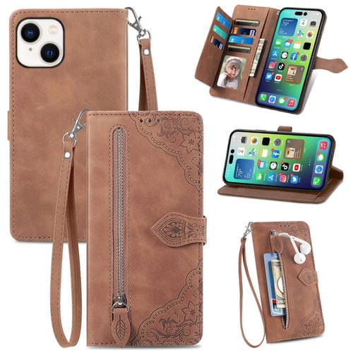 Estuche para Teléfono iPhone 15 Cuero con Cremallera y Flor en Relieve (Marrón)