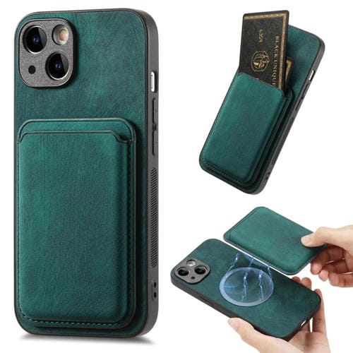 Pour iPhone 15 Étui de téléphone en cuir rétro magnétique avec sac à cartes (vert)
