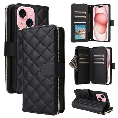 Funda para Teléfono iPhone 15 Cuero Hebilla Torre Cremallera Rombal Cruzada Cordón (Negro)