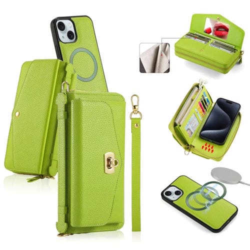 For iPhone 15 MagSafe Crossbody Wallet Multifunctional Zipper Litchi Leather Phone Case (Green)