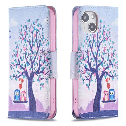 Pour iPhone 15 Étui de téléphone en cuir à rabat à motif de dessin coloré (hibou)
