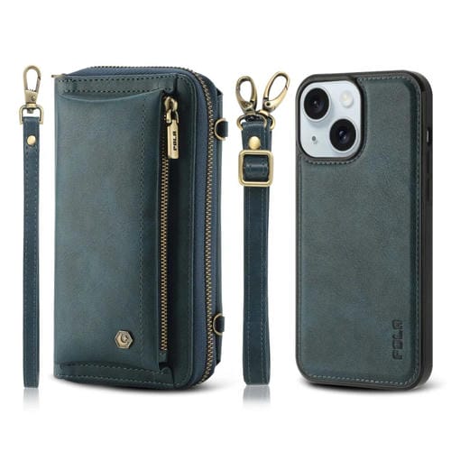 For iPhone 15 Plus Crossbody Leather Phone Case with Multifunctional Zipper Wallet (Green)