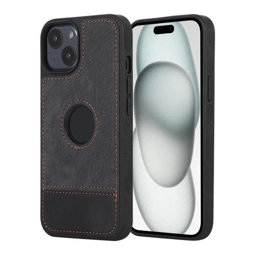 For iPhone 15 Plus Splicing Stitching PU Phone Case with Hollow Cutout (Black)