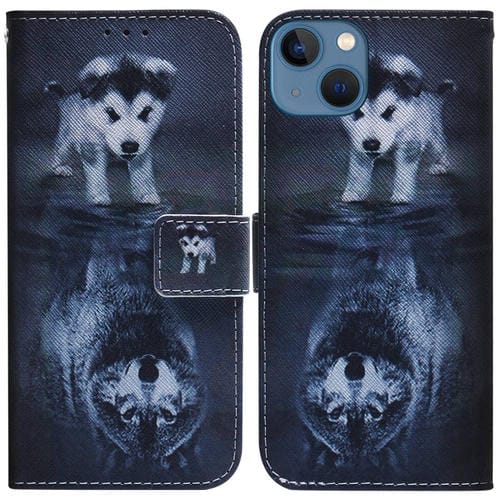 Estuche de Teléfono iPhone 15 Plus Cuero con Tapa Dibujo Coloreado (Lobo y Perro)