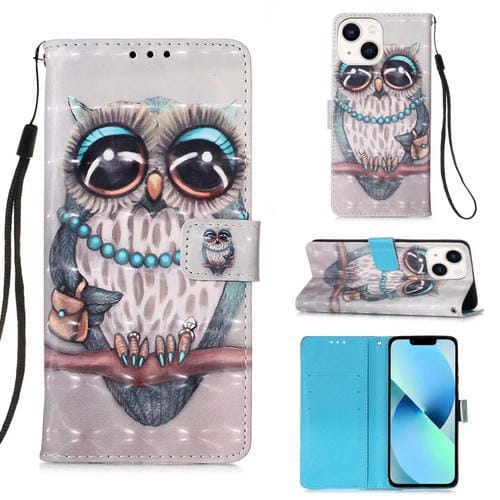 Estuche para Teléfono iPhone 15 Plus Cuero Tapa Horizontal Pintura 3D (Búho Gris)