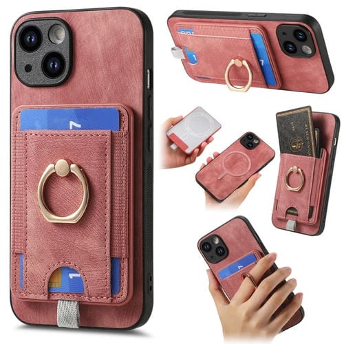 Funda de Cuero para Teléfono iPhone 15 Plus con Bolsa para Tarjeta Magnética Divisible Retro (Rosa)