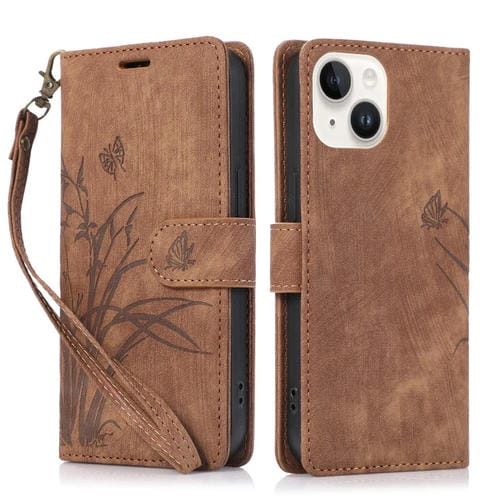 For iPhone 15 Plus Orchid Butterfly Embossed Leather Phone Case (Brown)