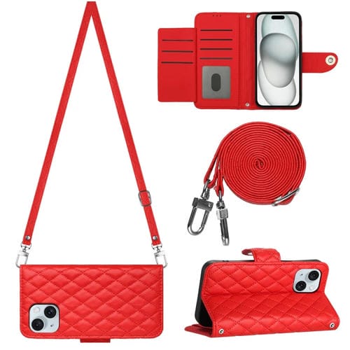 For iPhone 15 Plus Rhombic Texture Flip Leather Phone Case with Long Lanyard (Red)