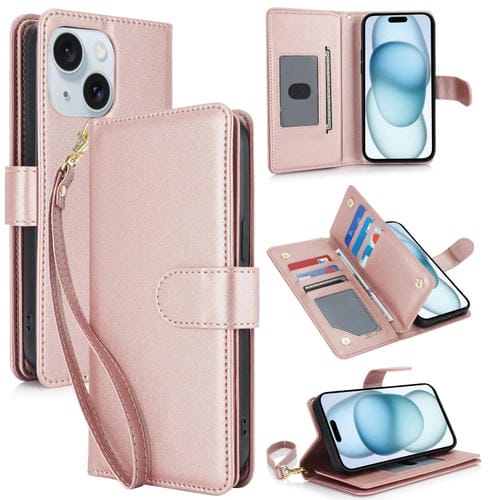 For iPhone 15 Plus RFID Leather Phone Case Multi-Card Wallet (Rose Gold)