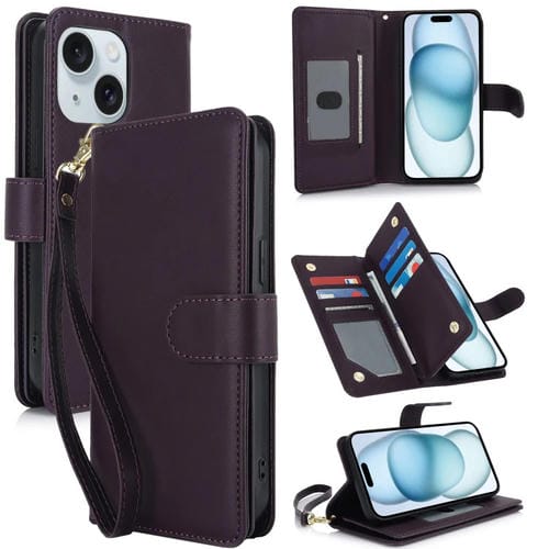 For iPhone 15 Plus RFID Leather Phone Case Multi-Card Wallet (Dark Purple)