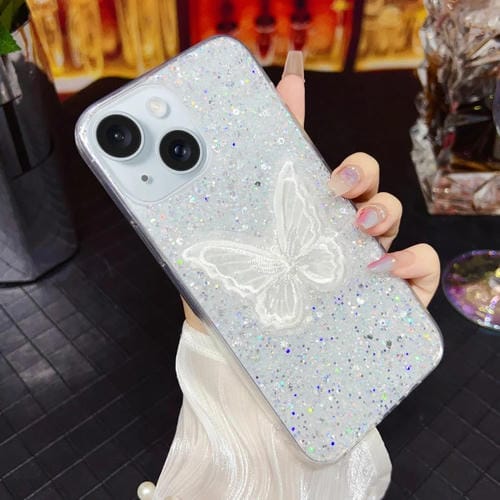 For iPhone 15 Plus Starry Sequins Embroidery Butterfly Epoxy TPU Phone Case (Silver)