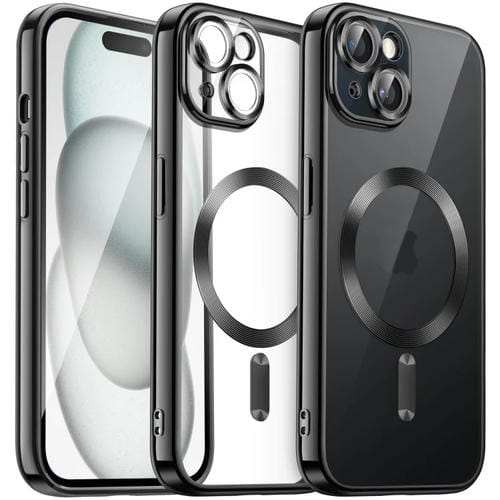 For iPhone 15 Plus Magnetic Transparent Electroplated TPU Phone Case (Black)