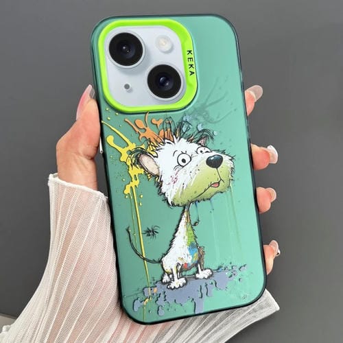 For iPhone 15 Plus Phone Case IMD Animal Graffiti TPU+PC Double-sided (White Melt Green Dog)
