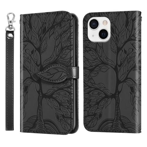 Funda para iPhone 15 Plus Life Tree Relieve Patrón de Cuero para Teléfono (Negro)