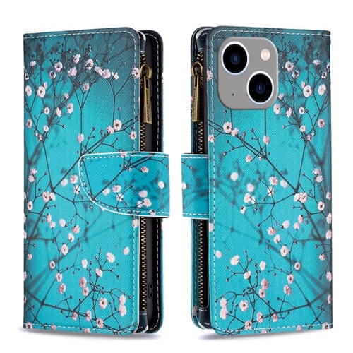 Funda de Cuero para iPhone 15 Plus con Cremallera Patrón Dibujo Coloreado (Flor de Ciruelo)
