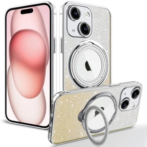 For iPhone 15 Plus Rotation MagSafe Holder Gradient Glitter TPU Phone Case (Gold)