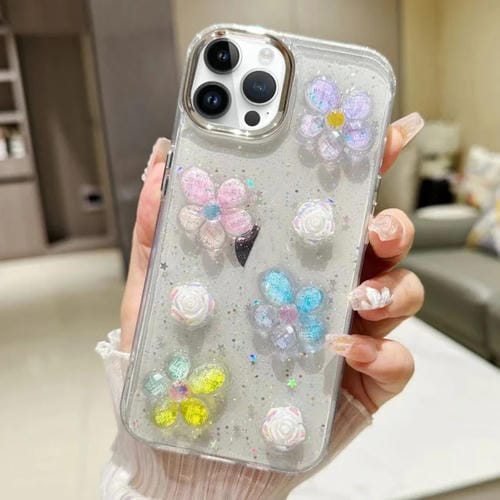 Funda para Teléfono iPhone 15 Pro 3D Flower Glitter Epoxy TPU (Flores de Colores)