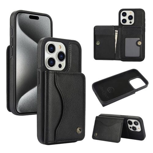 Funda para iPhone 15 Pro Awquer Cuero Tapa Horizontal Tarjetas Soporte (Negro)