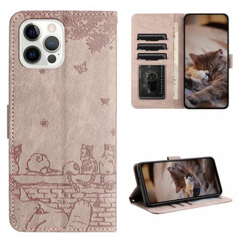 Funda de Cuero para iPhone 15 Pro Cat Relieve Patrón con Cordón (Gris)