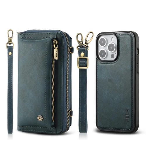 Funda de Cuero para Teléfono iPhone 15 Pro Crossbody con Billetera y Cremallera Multifuncional (Verde)