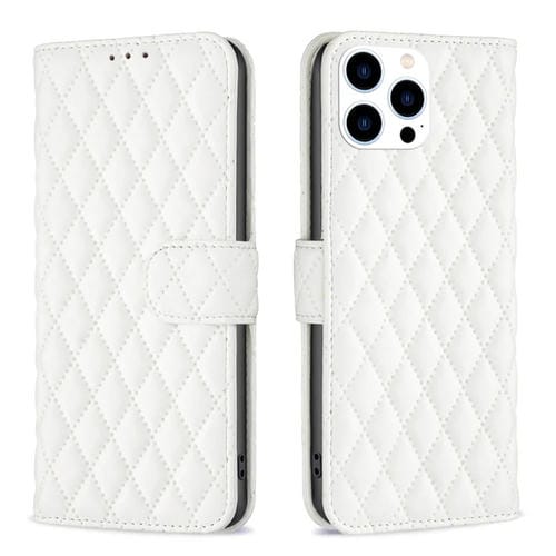 Funda para Teléfono iPhone 15 Pro Diamond Lattice Wallet Flip de Cuero (Blanco)