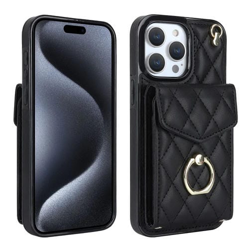Estuche para Teléfono iPhone 15 Pro Bolsa para Tarjetas Textura Rómbica Cordón Largo (Negro)