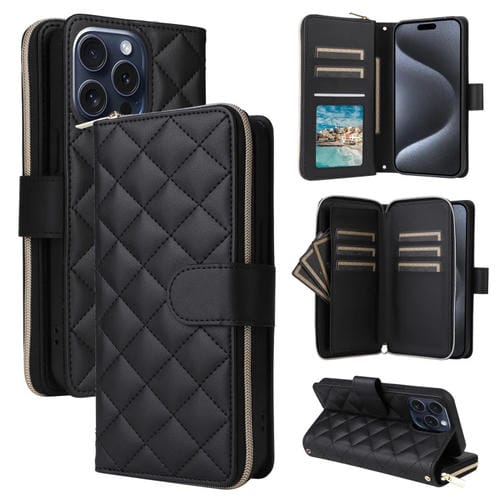 Funda para Teléfono iPhone 15 Pro Cuero con Hebilla Torre y Cremallera Rómbica Cruzada con Cordón (Negro)