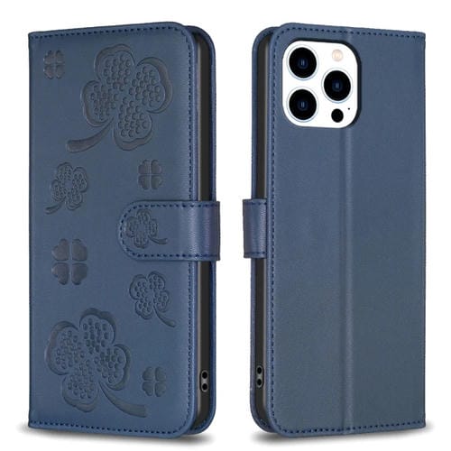 Pour iPhone 15 Pro Max Étui de téléphone en cuir gaufré à quatre feuilles (bleu)