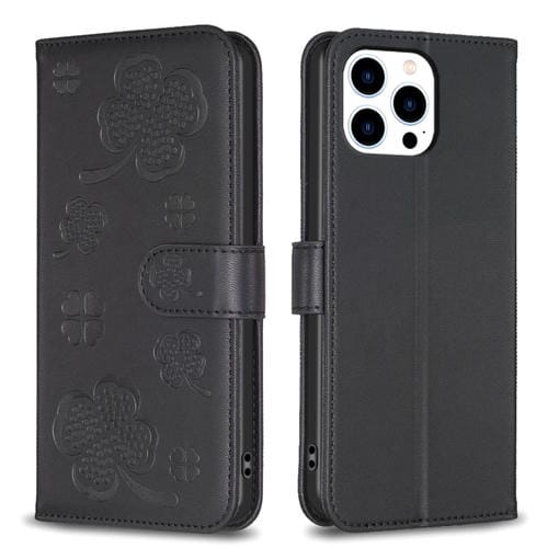 Pour iPhone 15 Pro Max Étui de téléphone en cuir gaufré à quatre feuilles (noir)
